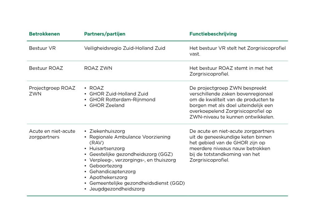 Voor Zuid-Holland Zuid is de GHOR, onder leiding van de DPG, verantwoordelijk voor het gehele proces van de totstandkoming van het ZRP. Binnen het project werken we continue en nauw samen met verschillende partners en partijen. In onderstaand overzicht is weergegeven welke partners en partijen betrokken zijn en wat zij betekenen binnen het project ter ontwikkeling van het ZRP.
